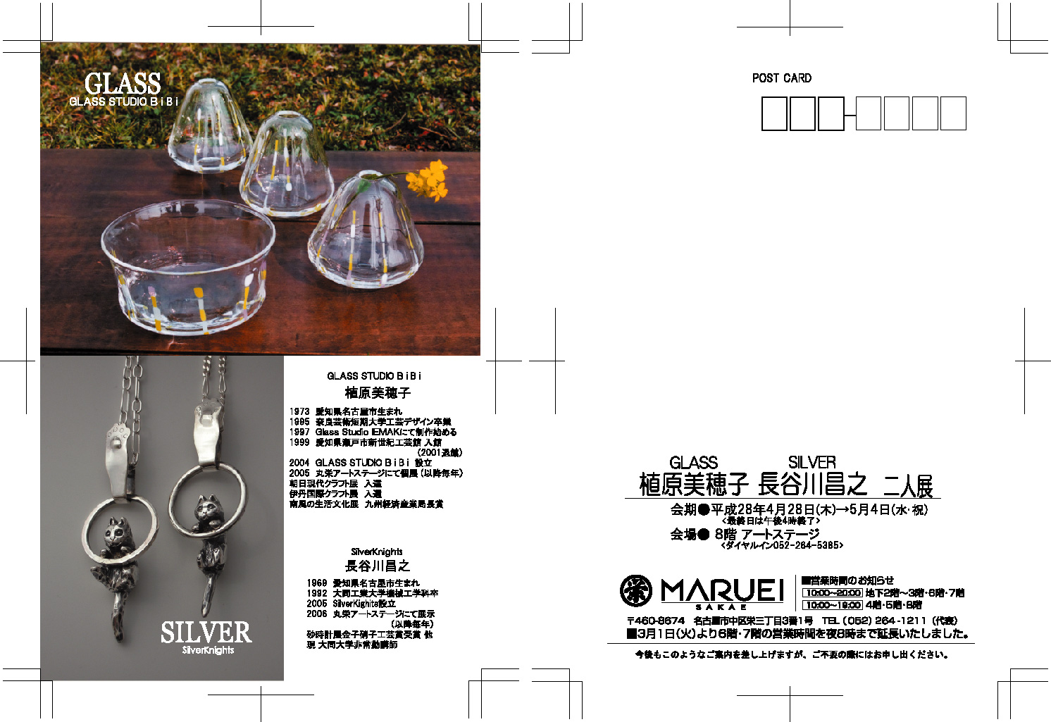 名古屋市在住のガラス作家 植原美穂子さんとシルバーアクセサリー作家 長谷川昌之さんの個性あふれる作品を集め展示販売致します。