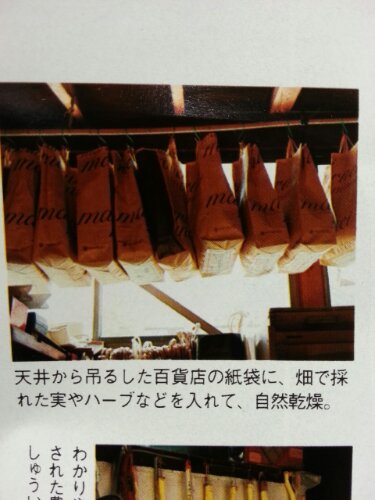 天井から吊るした百貨店の紙袋に、庭でとれた実やハーブなどを入れて自然乾燥させていると記事に登場した百貨店の紙袋とは アートステージのある丸栄百貨店の袋なのです。